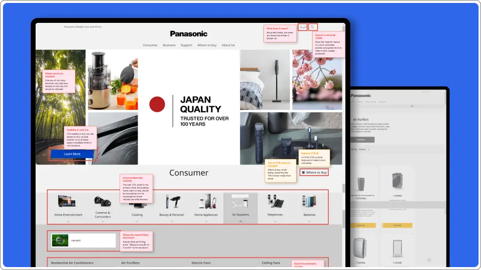 As part of an internal design initiative at my workplace, I conducted a UX audit on the Panasonic MEA website alongside two other digital platforms. The initiative aimed to establish UX auditing as a service, expanding company’s portfolio and attracting new clients by showcasing our expertise.