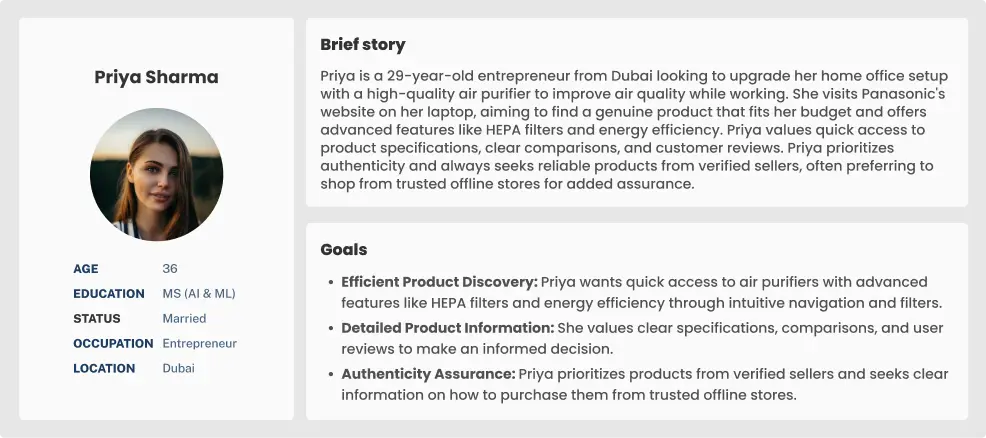 Due to the project's short 7-day timeline, I couldn’t conduct in-depth user research or access Panasonic’s data and analytics. However, understanding user behavior was crucial for evaluating the website’s UX. To bridge this gap, I organized a 30-minute session with six colleagues, where I introduced the Panasonic website and asked them to create personas based on their understanding of the product.
